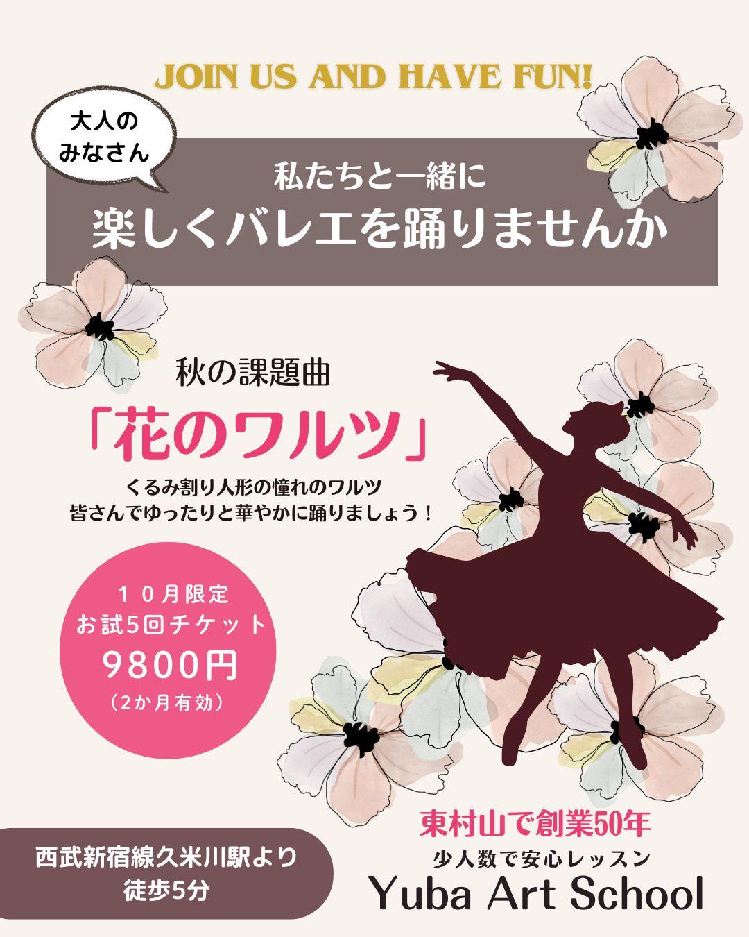 対象:大人の方 入門~初級レベル バレエ経験2年以上 お久しぶりの方もご安心ください 50代〜60代の方も大歓迎です! 目安:バーレッスン・センターレッスンを 一通りやったことのある方 レッスン内容: 通常の基礎レッスン 踊りの練習(15分程度) 半年くらいかけてゆっくりすすみます 限定2名様募集 定員になり次第締め切りますので お早めにお申し込みください スケジュールは変更になる場合もございます 持ち物・服装・その他 水分補給の飲み物 動きやすい服装でお越しください |